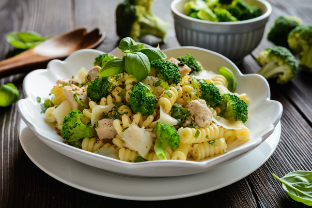 Ingredienser til 4 posjoner:3 kyllingfileter2 porsjoner pastaskruer ¨100 g fetaost '1/3 brokkoli100 g aspargestopper1 paprika1 eple (med skall) Dressingen består avEt glass pesto2 ss vann1 ss olje½ lime – saften av denneLitt saltFor å lage denne digge salaten kutter du kyllingfilet i biter og steker i stekepanne. Du kan også steke de hele i ovnen i en ildfastform, og dele i biter etterpå. Hakk grønnsaker i ønsket størrelse og fetaost i biter. Bland alle ingrediensene i dressingen, og rør så denne inn i salaten. Kaloriinnholdet i hele porsjonen er 2015 kcal.