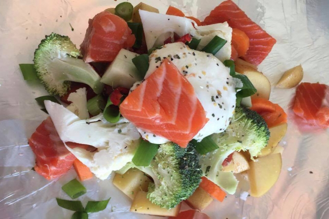 Ha en god ss creme fraiche over laksen og pakk så alt godt inn i folien. Det er viktig at folien blir tett.