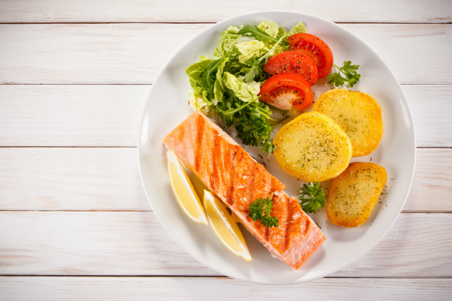 Legg laksefileter på en liten ildfastform/folieform og legg ved siden av potetene. Er det fullt på brettet kan du sette ildfastformen på stekerist og ha over potetene. Stekes i 10-15 minutter på 200 grader.