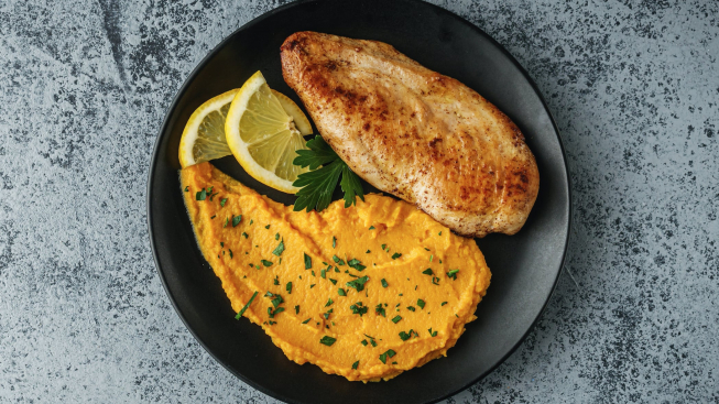 Rens søtpotetene og kutt dem i mindre biter, kok bitene til de er møre. Hell av vannet og mos potetene sammen med creme fraiche, smør, salt og pepper.