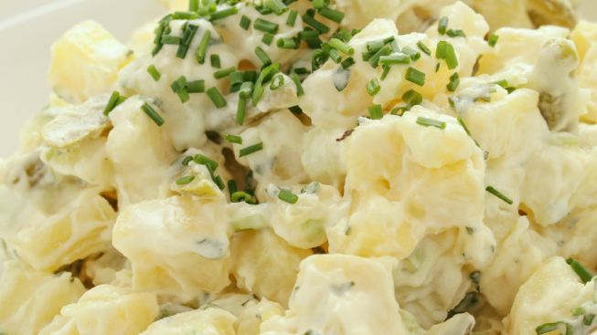 Kok potetene møre og la de avkjøle helt. Del de i terninger, ca 2*2 cm.